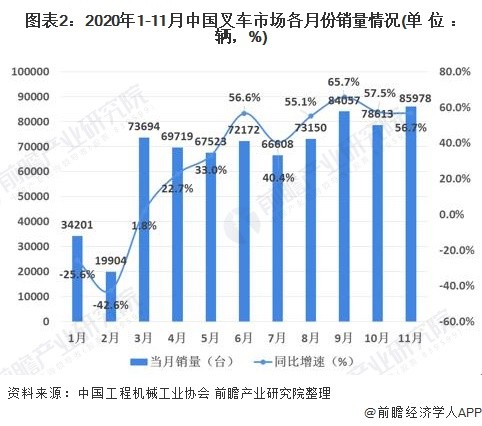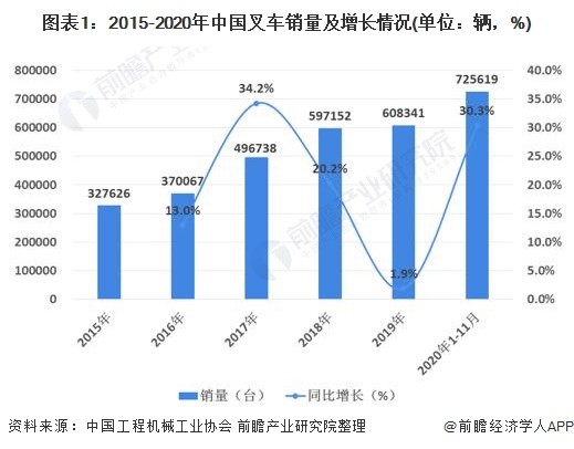 2020年受益于國內(nèi)新冠疫情得到迅速控制,國內(nèi)制造業(yè)、物流業(yè)的快速恢復,叉車市場需求快速增長。2020年1-11月份的累計銷量達到72.56萬輛,與2019年同期相比增長30.3%。