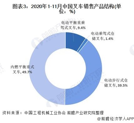 叉車主要分為四類,包括內(nèi)燃平衡重式叉車、電動平衡重叉車、電動乘駕式倉儲叉車、電動步行式倉儲叉車,分別對應歐美分類標準的IV/V、I、 II、III類叉車。從2020年1-11月份的銷售結(jié)構(gòu)來看,內(nèi)燃平衡重式叉車和電動步行式倉儲叉車占比最高,分別為49.7%和39.5%。
