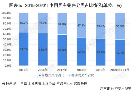 從2015-2020年中國叉車銷售分類占比情況來看,電動式叉車的銷量占比逐年提升,從2015年的36.7%提升至2020年1-11月份的50.3%。主要是受到環(huán)保政策及室內(nèi)作業(yè)環(huán)境要求的驅(qū)動作用,電動叉車需求持續(xù)增長。另外,根據(jù)中國工程機械工業(yè)協(xié)會資料顯示,在發(fā)達國家的叉車銷售結(jié)構(gòu)中電動叉車占比均超60%,未來我國電動叉車比例將持續(xù)提升。