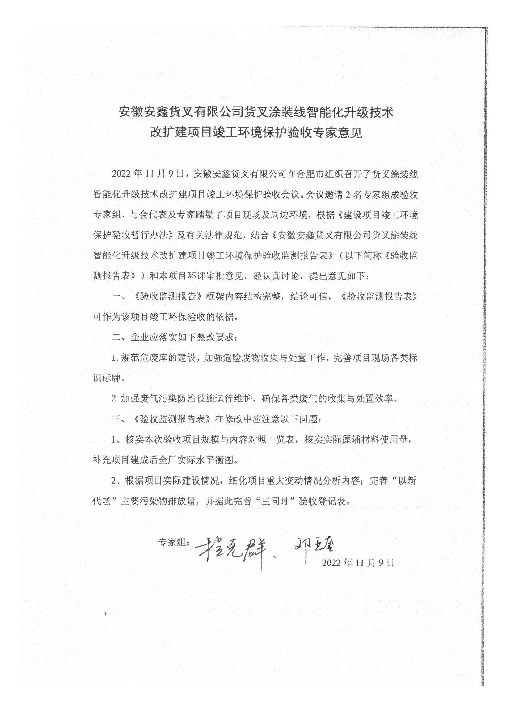 1、安徽安鑫貨叉有限公司貨叉涂裝線智能化升級技術(shù)改擴(kuò)建項目竣工環(huán)境保護(hù)驗收調(diào)查報告及驗收意見